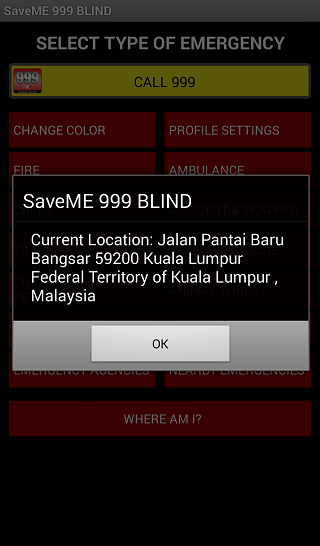 - Butang ‘Where Am I’ – Klik butang ‘Where Am I’ dan aplikasi SaveME 999 BLIND akan membacakan alamat lokasi anda.