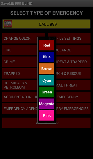 - Pilihan Warna – Anda boleh menukar warna aplikasi SaveME 999 BLIND mengikut kesesuaian (7 pilihan warna).