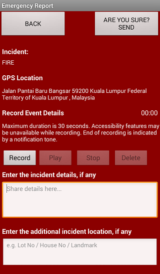 Setelah jenis kecemasan dipilih, pengguna boleh memasukkan maklumat insiden dan lokasi dengan menaip pada ruangan yang disediakan. Pengguna juga boleh menghantar rakaman suara selama 30 saat ke Pusat Panggilan Kecemasan MERS999 untuk permohonan bantuan.